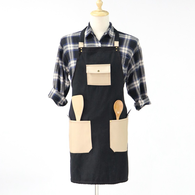Black Cotton And PU Pocket Design Long Polyester-cotton Canvas Apron
