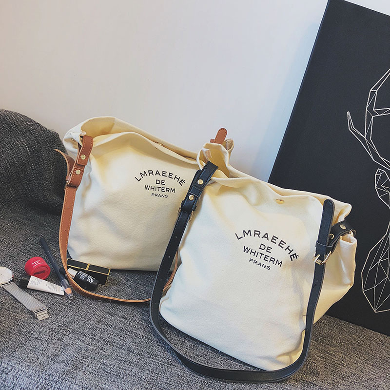 Canvas bag female single shoulder large capacity simple student bucket bag with leather strap