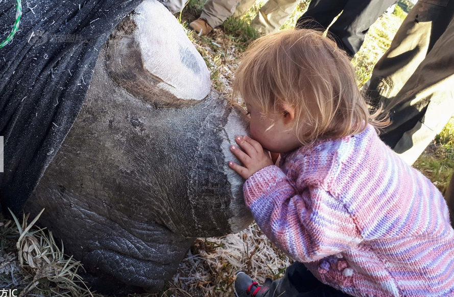 Under Ayesha Cantor’s protected area, her friend's 3 years old daughter Ava gently walked up and kissed rhinoceros very gently to hope that the White Rhinoceros got better after she was hit with the narcotic drug and took off the horns.